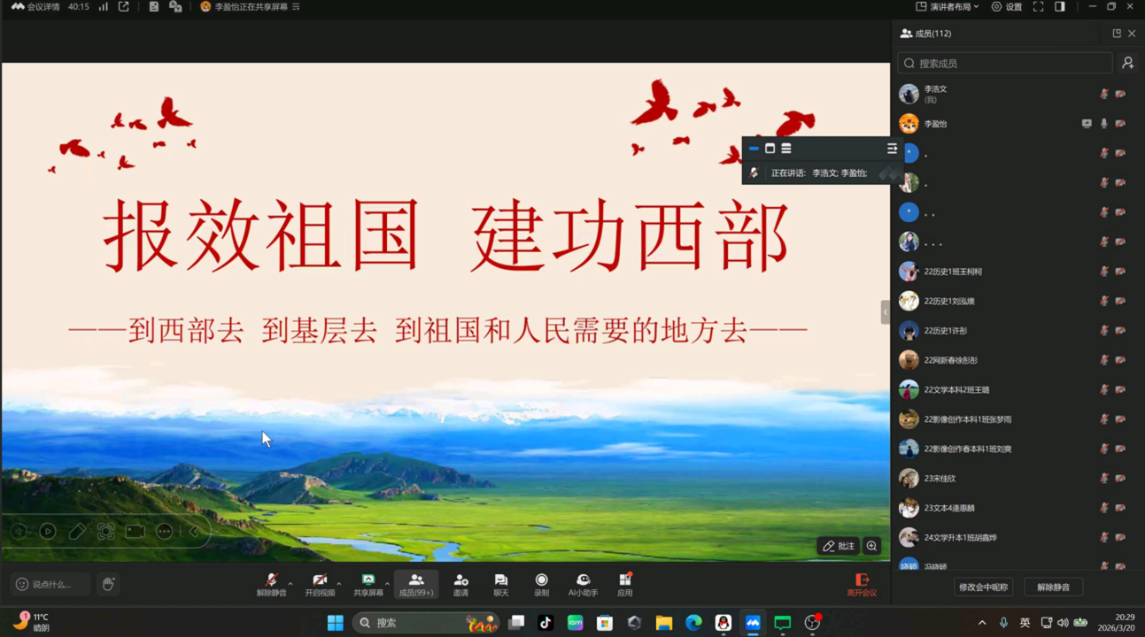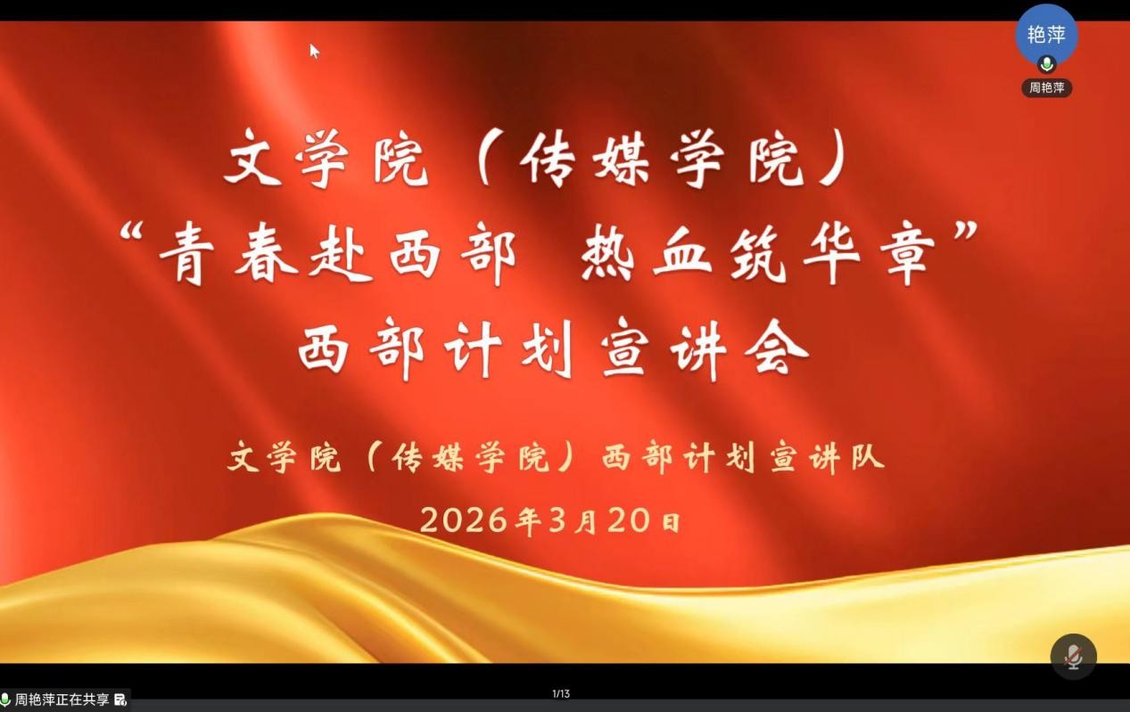 为积极响应国家西部建设号召,推动2026年西部计划招募工作有序开展,320日,BBIN宝盈集团举办“青春赴西部 热血筑华章”西部计划线上宣讲会,学院100余名师生参加。